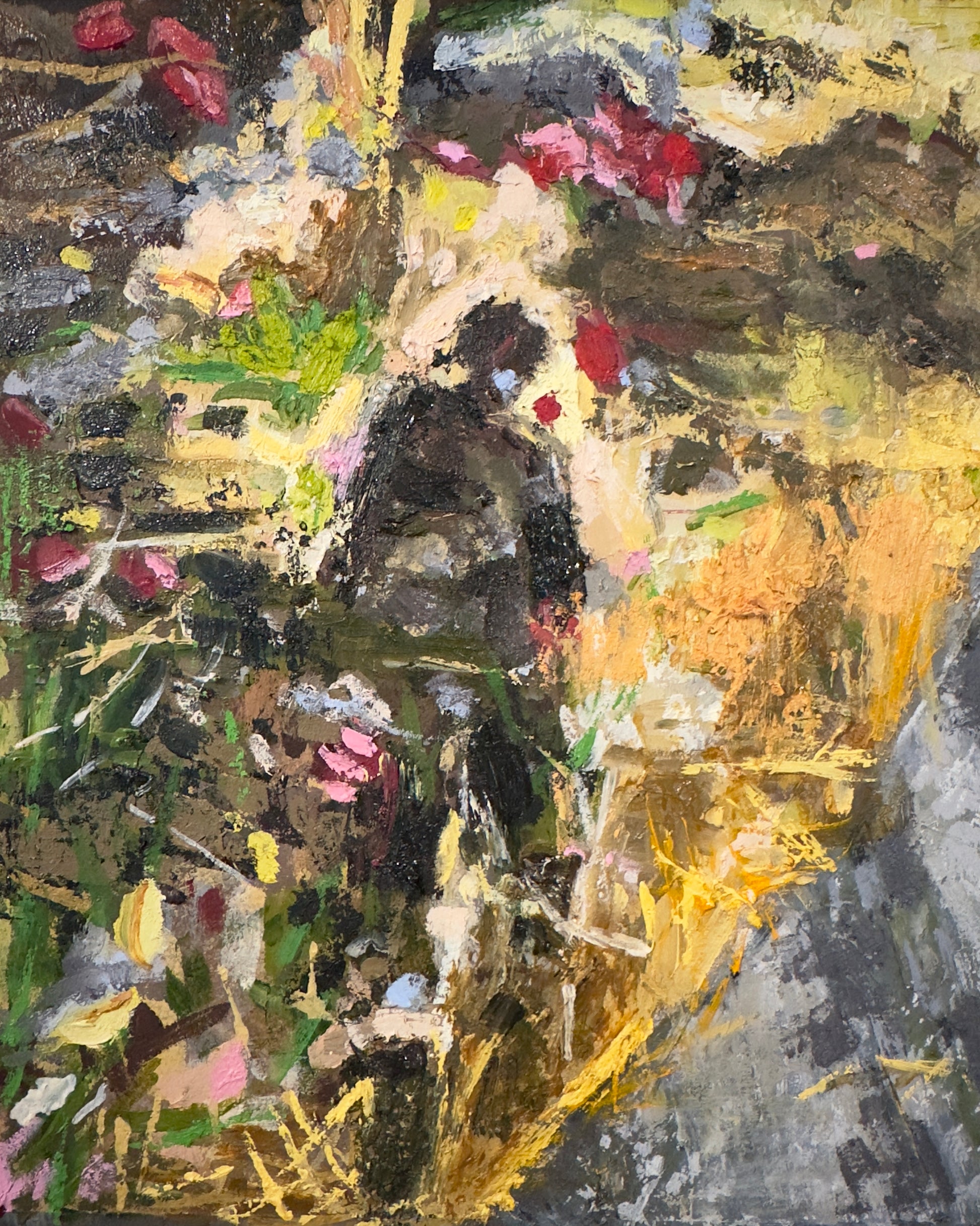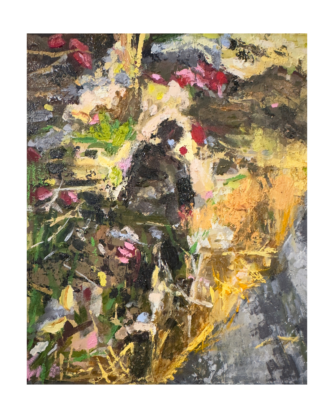Oil, pigment, and pastel on paper.